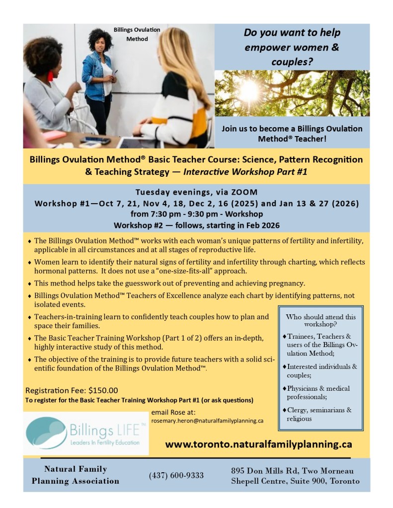 The Natural Family Planning Association, the one in Toronto, and the Natural Family Planning Association – Ontario will be presenting the Basic Teacher Training Workshop Part #1 this fall 2025.This will bepresentedvia ZOOM, on alternative Tuesdays, starting in October 2025.